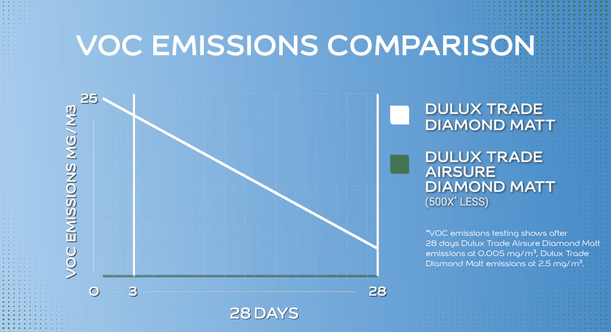 Although the pollution impact of VOCs from paint is very small (less than 2% of the total amount of VOCs emitted) Dulux Trade Airsure represents our continued efforts to create innovative solutions to minimize the impact on IAQ in homes and commercial spaces.